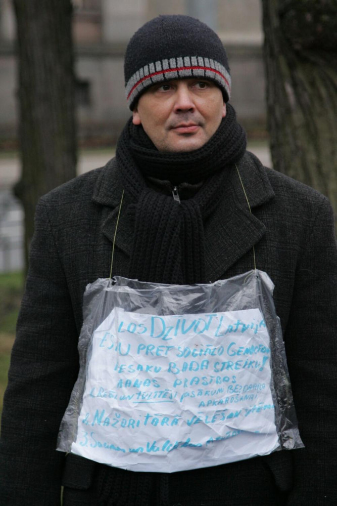 Valmierietis Gints iepretī Ministru kabineta ēkai stāv kopš pirmdienas pulksten deviņiem rītā. Viņš nemūk no lietus un aukstuma, naktīs guļ teltī, kas uzcelta uz asfalta, jo pilsētas zaļumos atrasties liedz likums.