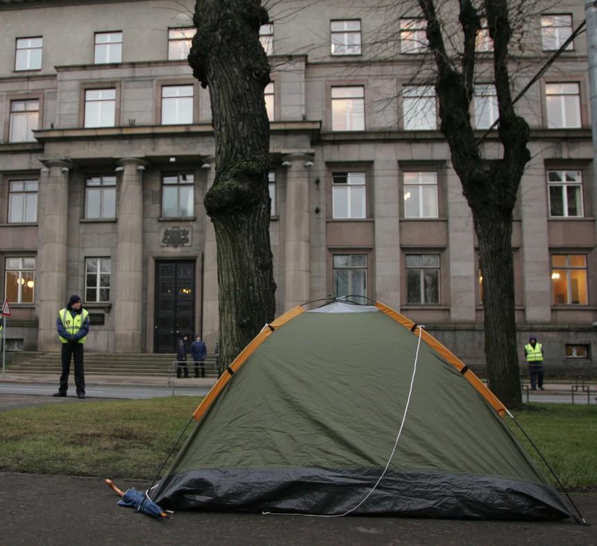 Patlaban skvērā iepretim Ministru kabinetam ir novietotas trīs teltis un viens apklāts motocikls. Starp teltīm ir novietoti divi soliņi, uz kuriem sēž vairāki cilvēki.
