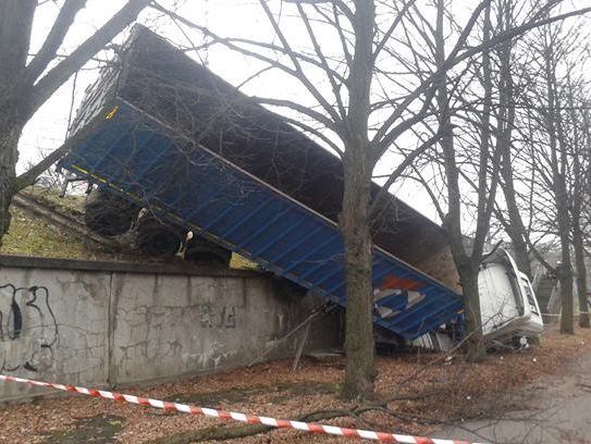 Šorīt Rīgā no Brasas tilta nobraukusi un apgāzusies kravas automašīna