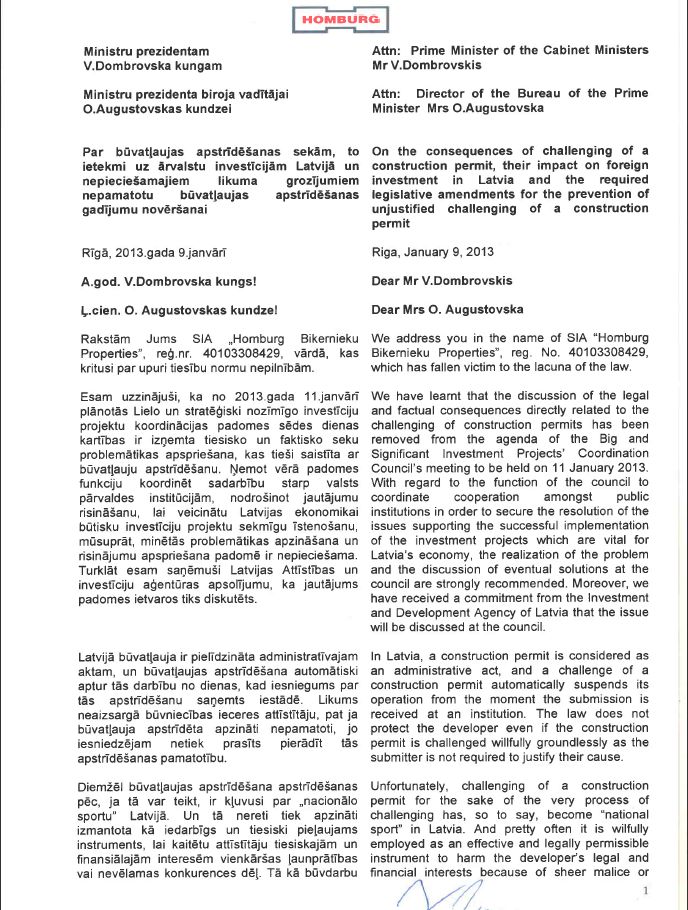 Tikmēr Ministru prezidents Valdis Dombrovskis kategoriski noliedz, ka jebkad būtu ticies ar "Homburg Bikernieku Properties". Šī gada 9. janvārī premjers saņēma no kompānijas vēstuli, kurā tika izklāstīts lielo, ietekmīgo investoru sūrais mūžs, neskaitāmās problēmas un administratīvais slogs. Taču premjers šīs problēmas izskatīšanu novirzīja tieslietu, kā arī ekonomikas ministram, atsakot uzņēmējiem tikšanos.