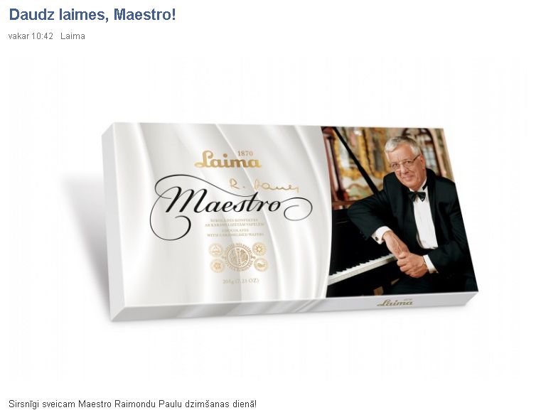 12. janvārī, kad tautā iemīļotais komponists Raimonds Pauls svin savu dzimšanas dienu, AS Laima, sveicot komponistu, pasniedza pirmo eksemplāru jauno šokolādes konfekšu Maestro.