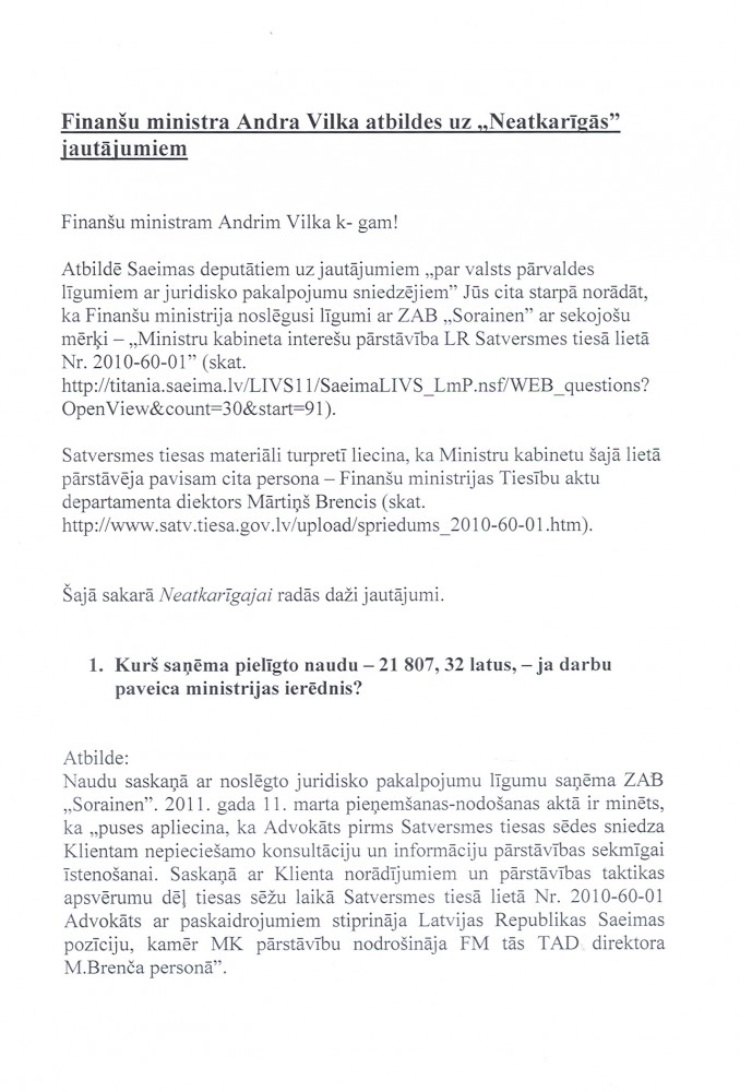 FM sniedza atbildi, ka naudu saņēma birojs Sorainen un par to pat sastādīts pieņemšanas – nodošanas akts, kurā apliecināts, ka «Advokāts» sniedzis «Klientam» (acīmredzot domāts MK jeb FM) «nepieciešamo konsultāciju». Bet «taktikas apsvērumu dēļ» tiesas sēžu laikā «Advokāts» (acīmredzot domāts M. Paparinskis) «ar paskaidrojumiem stiprināja Latvijas Republikas Saeimas pozīciju».
