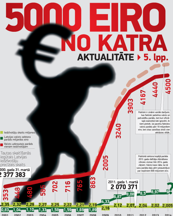 Latvijas valsts un pašvaldības ar savām iestādēm un uzņēmumiem ir ieaugušas parādos, kuru pamatsummas dzēšanai no katra pašlaik Latvijā palikušā iedzīvotāja jāpaņem vismaz pieci tūkstoši eiro.