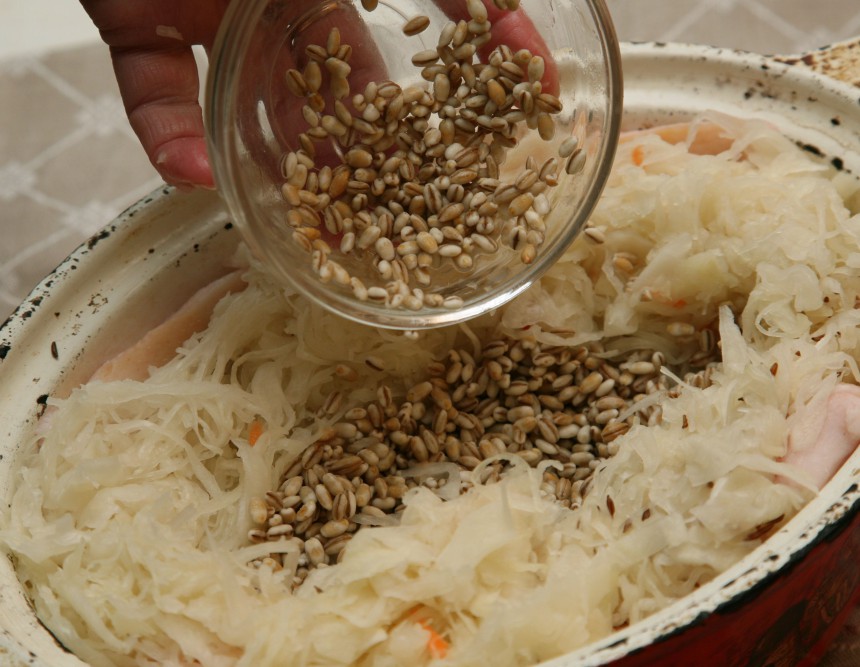 aptuveni 1,5 kg skābētu kāpostu, kam nedaudz pievienoti rīvēti burkāni un ķimenes;