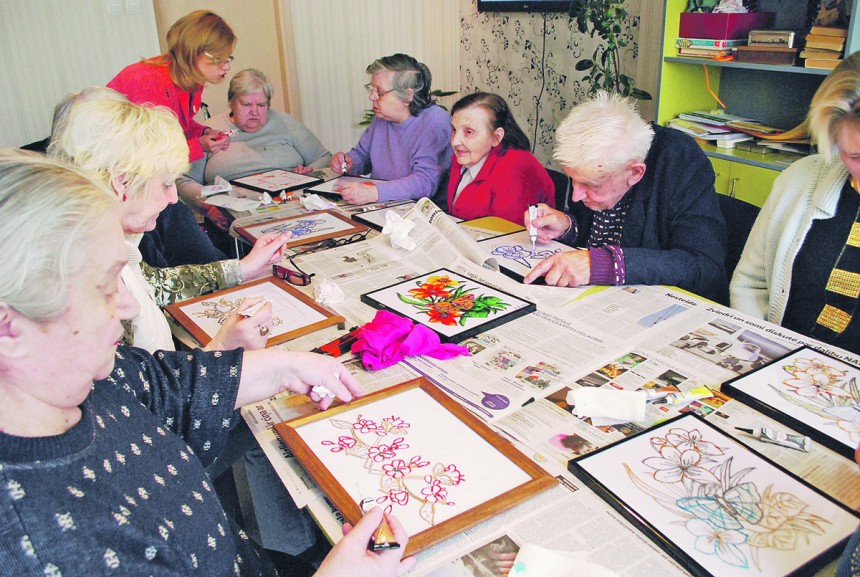 Latvijas Samariešu apvienības sociālās aprūpes centrā Pārdaugava seniori pulcējās uz pirmo stikla apgleznošanas nodarbību projekta Aktīvām vecumdienām! ietvaros.