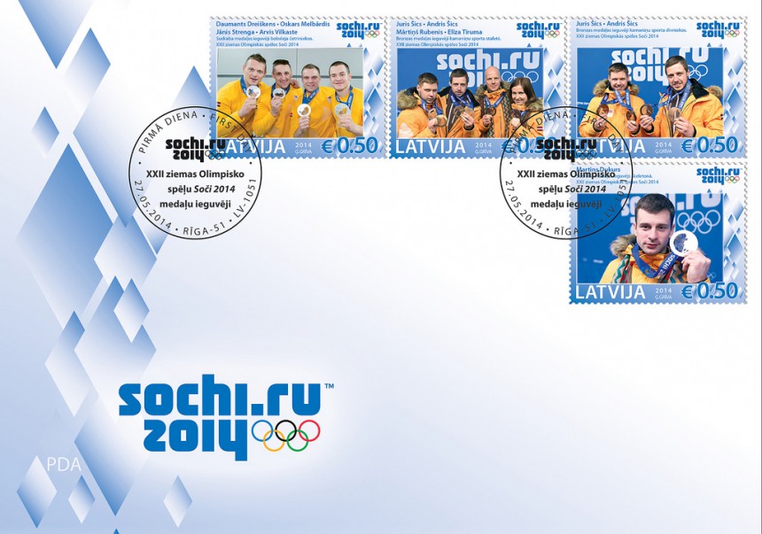 Latvijas Pasts sadarbībā ar sporta federācijām un Latvijas Olimpisko komiteju (LOK) izdevis četras pastmarkas un speciālu aploksni, kas veltīta šogad notikušo XXII Ziemas Olimpisko spēļu Latvijas medaļniekiem. Jauno pastmarku prezentācija ar pastmarkās attēloto Latvijas olimpiešu piedalīšanos plānota 2014.gada 27.maijā plkst.11 pasta centrā Sakta, Brīvības bulvārī 32, kur sportistus sveiks arī satiksmes ministrs Anrijs Matīss, Latvijas Pasta un LOK vadība.