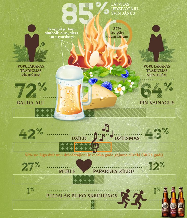 Kā rāda alus darītavas Aldaris veiktā aptauja Aldara Papardes indekss, šogad Jāņus svinēs 85% aptaujāto. Respondenti kā visizplatītāko (61%) šo svētku tradīciju min alus baudīšanu, kam seko Līgo dziesmu dziedāšana (42%), vainagu pīšana (41%) un lēkšana pāri ugunskuram (37%), bet 13% atzīst, ka neievēro nevienu Jāņu tradīciju. Papardes ziedu Līgo vakarā dodas meklēt vien aptuveni 20% aptaujāto.