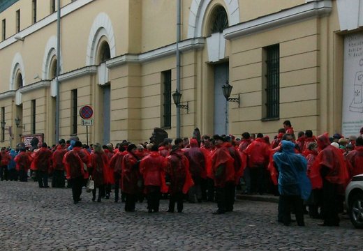 Piketētāju nav daudz, taču viņi rada pamatīgu troksni, jo ir bruņojušies ar svilpēm, bungām un citiem troksni radošiem atribūtiem.