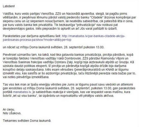 Latvijas interneta lietotāji ir pauduši savu neizpratni par to, ka viņu epastos šodien ir atnākusi ziņa no paša Rīgas mēra un partijas"Saskaņa" līdera Nila Ušakova, kurā politiķis aicina tautiešus "paust savu viedokli un attieksmi gan ierodoties uz mītiņu Doma laukumā svētdien, 18. septembrī, pulksten 13.00, gan pierakstoties portālā manabalss.lv, jo sabiedŗibas reakcija ir vienīgais, kas var iespaidot varas mašīnu, kura šobrīd "iet uz visu banku", lai izpārdotu un noprovozētu vēl pēdējos valsts aktīvus".