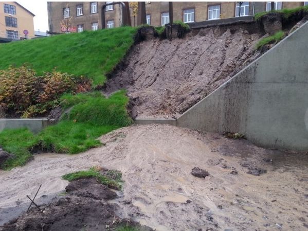 Spēcīgā lietusūdens straume Jāņa Čakstes bulvārī vietumis nobrucinājusi 2012. gada novembrī atklātās Driksas krastmalas promenādes nogāzi, kā arī izskalojusi pamatu zem gājēju ietves, bruģa vietā atstājot neglītu caurumu.