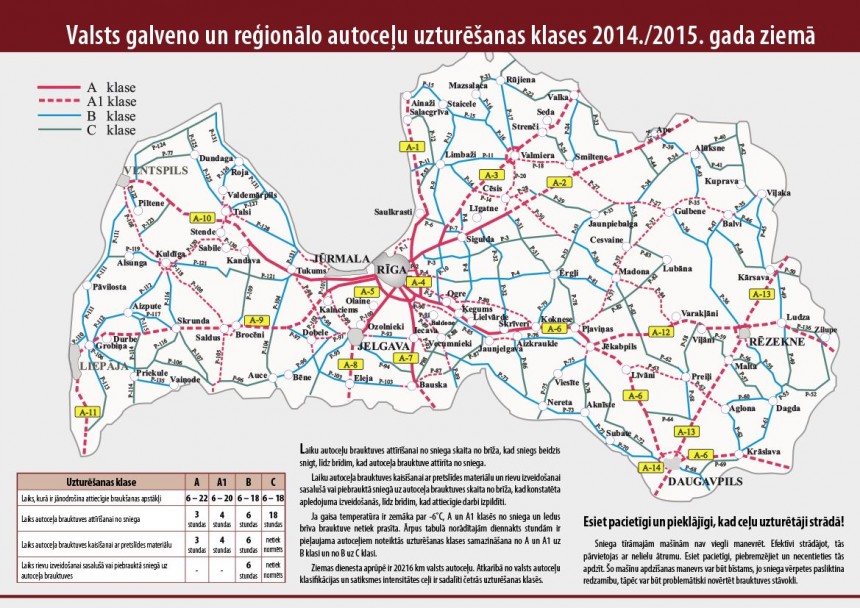 Atgādinām, ka līdz ar sezonu mainās arī ceļu uzturēšanas prasības. Ziemā tas nozīmē diezgan atšķirīgus normatīvos braukšanas apstākļus dažādu kategoriju ceļiem. Valsts autoceļi ir sadalīti piecās ziemas uzturēšanas klasēs – A(augstākā), A1, B, C un D(zemākā) atkarībā no ceļu klasifikācijas, satiksmes intensitātes, seguma tipa, tehniskā stāvokļa, plānotā (pieejamā) finansējuma un sociālekonomiskās nozīmes. Tāpat noteikti sliktā tehniskā stāvoklī esošie ceļu posmi, kas, objektīvu iemeslu dēļ, apkalpojami ar atkāpēm no uzturēšanas klasēm.