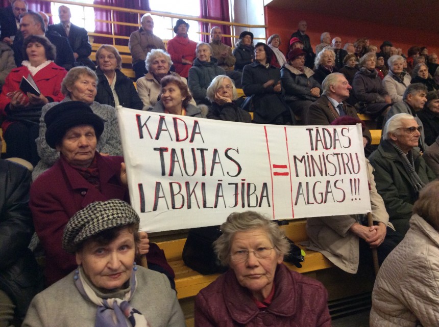 Pensionāri gan skaļi iebilda, jo pielikums neesot bijis septiņi eiro, bet vidēji 3,5 eiro. "Viekārši smieklīgi," secināja pensionāre no Krāslavas. Sestdien Rīgā, Sporta manēžā pulcējās vairāki simti pensionāru no visiem Latvijas reģioniem, lai tiktos ar jaunievēlētās Saeimas deputātiem un citiem politiķiem. Uz tikšanos ar senioriem bija ieradušies 11. Saeimas deputāti Imants Parādnieks (Nacionālā apvienība) un Aija Barča (Liepājas partija, ZZS), Rīgas mērs Nils Ušakovs (Saskaņas centrs), jaunievēlētie – Inguna Sudraba (No sirds Latvijai) un Mārtiņš Šics (Reģionu partija). Jāpiebilst, ka arī Pensionāru federācijas vadītājs Andris Siliņš ir ievēlēts Saeimā no ZZS saraksta.