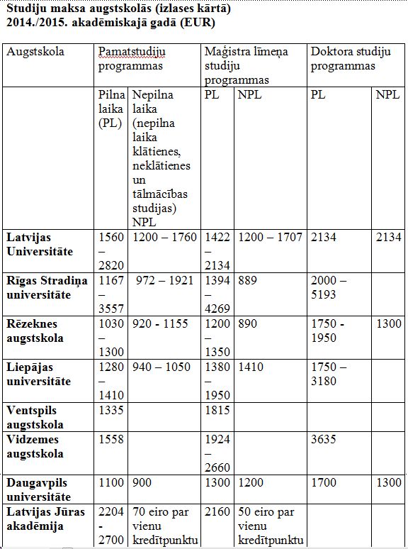 Tiem, kuriem budžeta vietas gājušas secen, studiju maksa, piemēram, pilna laika pamatstudijās, maciņa saturu ik gadu iztukšo par vidēji 1500 līdz 3000 eiro. Nepilna laika klātienes, neklātienes un tālmācības studijām cena ir zemāka. Arī mācības reģionālajās augstskolās lielākoties ir lētākas.