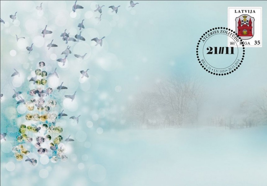 Speciālās aploksnes un zīmoga autore ir Anda Skadmane, un to dizainā izmantots Zolitūdes traģēdijā bojāgājušās Dainas Skadmanes darba Vēja egle fragments. Aploksne izdota 800 eksemplāru tirāžā.