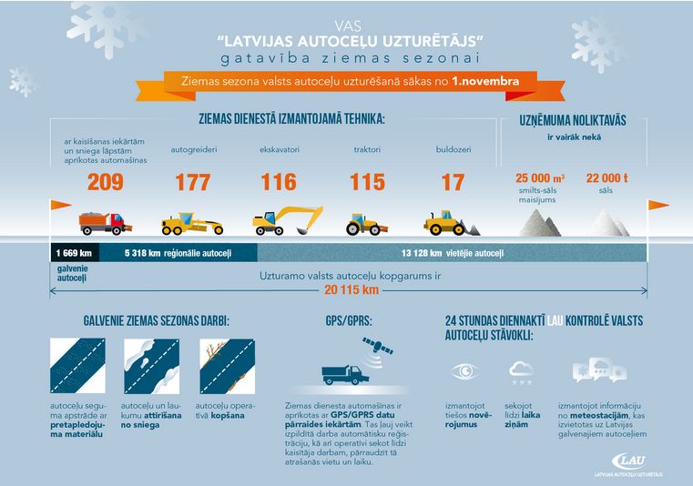 Ziemas sezona valsts autoceļu uzturēšanā sākas no 1.novembra. VAS „Latvijas autoceļu uzturētājs” (LAU) ir gatavs nodrošināt laika apstākļiem atbilstošus braukšanas apstākļus uz valsts autoceļiem vairāk nekā 20 tūkstošs km garumā.