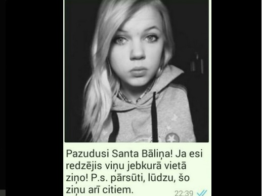 Kā jau ziņojām, sociālajos medijos cilvēki lūdza palīdzību 15 gadus jaunās Santas Bāliņas meklēšanā, kuru 21. janvāra rītā vecāki pieveduši pie Ventspils 6. vidusskolas, taču skolu jauniete tā arī nav apmeklējusi.