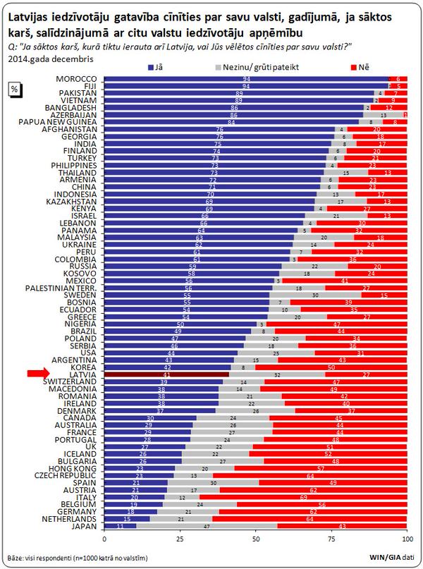 Pētījumu kompānijas "SKDS" vadītājs Arnis Kaktiņš sociālajā tīklā Twitter publicējis ziņu ar fotogrāfiju, kurā redzams, cik gatavi latvieši ir aizsargāt savu tēvzemi, salīdzinājumā ar citām valstīm.