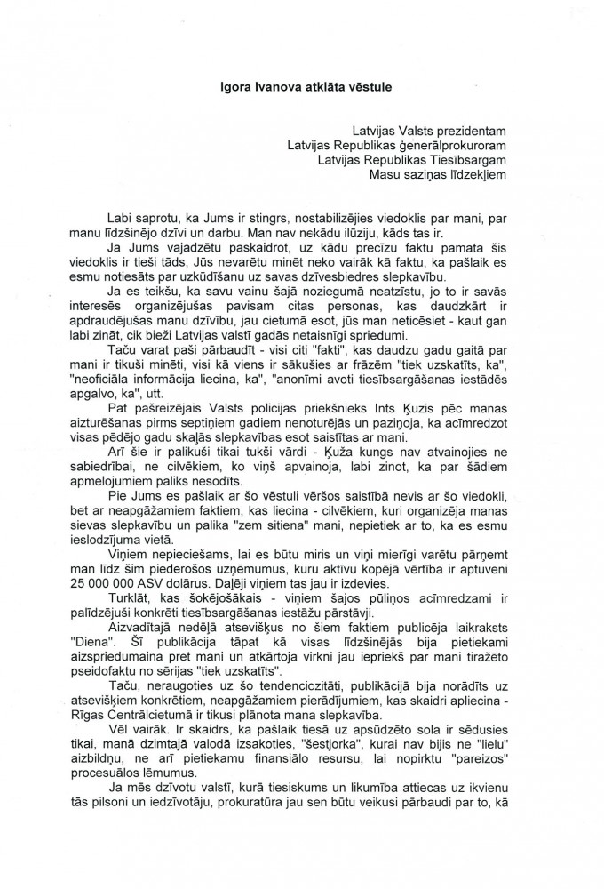 Neatkarīgajai atsūtītajā vēstulē Igors Ivanovs apgalvo, ka ar krimināllietas materiāliem par viņa paša slepkavības mēģinājumu joprojām nav iepazīstināts. Vainīgā persona, kas zina pasūtītājus, neesot pat nopratināta. Neinformējot par slepkavības mēģinājumu, «virkne tiesībsargājošo iestāžu amatpersonu» pasūtītājiem ļāvusi nozust.