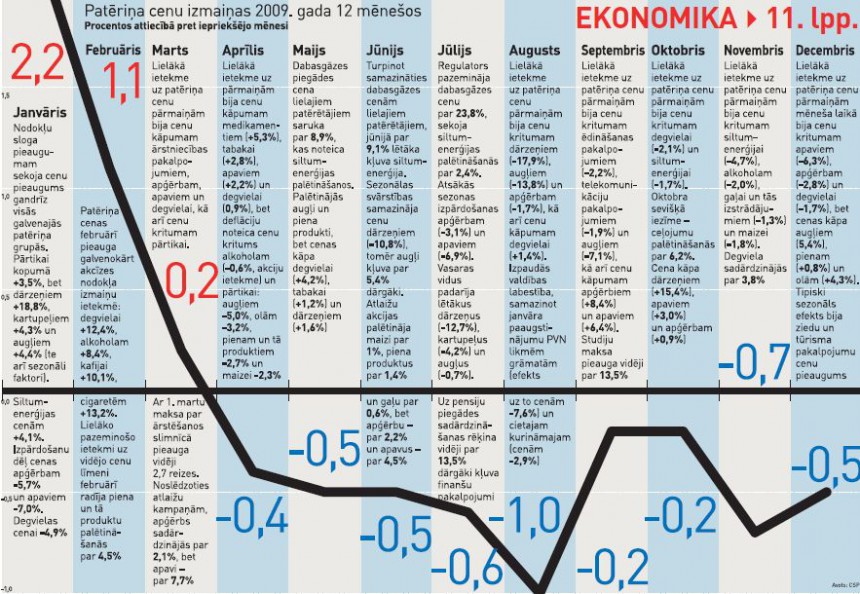 Otrkārt, 2009. gada patēriņa grozs tika aprēķināts 2008. gada beigās un visu gadu saglabāja trekno gadu izskaņas patēriņa struktūru, kaut gan reālajā dzīvē tā būtiski mainījās. Pagājušais gads vispār bija būtisku izmaiņu gads Latvijā, ko sevišķi uzskatāmi apliecināja pavērsiens no inflācijas uz deflāciju (uz negatīvu inflāciju, kā to tagad liek godāt Eurostat).