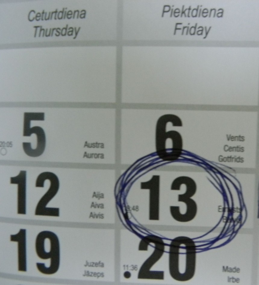 Saules kalendārā atrodamie ticējumi dod īpašas zīmes, kādēļ šajā "melnajā piektdienā" kā slikta zīme uztverama nosmērēšanās ar putekļiem, mālzemi, smiltīm, ķemes vai spoguļa saplēšana, asins tecēšana pa degunu un kurpes papēža nolūšana. Par brīdinājumu uzskatāma arī ūdens atslēgšana vai kanalizācijas problēmas. Savukārt, monētas atrašana šajā dienā sola lielu veiksmi.