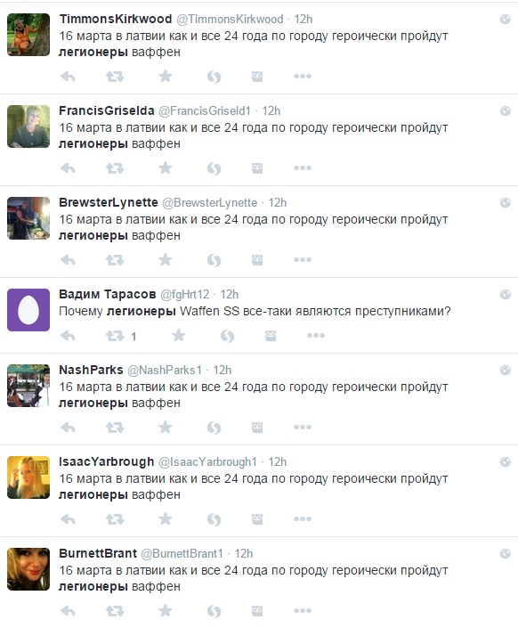 Jau novērots – interneta roboti sociālajā vietnē twitter sāk ievietot provokatīvus uzsaukumus un izteicienus 16. marta sakarā. Daži vaicā, kādēļ latviešu leģionāri netiek uzskatīti par kara noziedzniekiem, savukārt citi savā starpā šķietami nesaistīti, krievu valodā rakstoši profili publicē pilnīgi vienādus un aizvainojošus izteicienus 16. marta sakarā.
