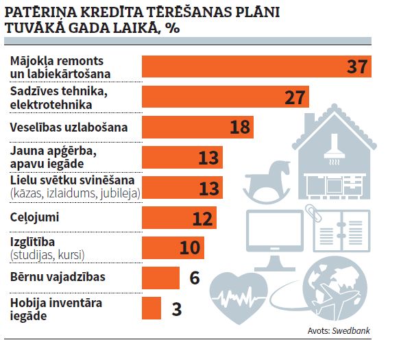 Swedbank iedzīvotāju aptaujas dati liecina, ka iespēju aizņemties dažādām ikdienas vajadzībām šogad apsver 21% iedzīvotāju. Aptuveni 37% plāno uzlabot esošo mājokli, izremontējot vannasistabu, virtuvi, iegādājoties jaunu sadzīves tehniku, mēbeles utt. Aptuveni 16% aptaujāto aizdevums būtu nepieciešams veselības uzlabošanai. «Protams, ir arī daļa iedzīvotāju, kuriem nauda būtu nepieciešama lielāku svētku, piemēram, kāzu, organizēšanai vai ceļojumam. Dāmas patēriņa kredītu nereti tērē jaunu apģērbu vai apavu iegādei, savukārt kungi šo naudu izmanto arī savam vaļaspriekam, piemēram, lai iegādātos tam nepieciešamo inventāru,» stāstīja Swedbank Privātpersonu finansēšanas lēmumu centra vadītājs Ainārs Balcers.