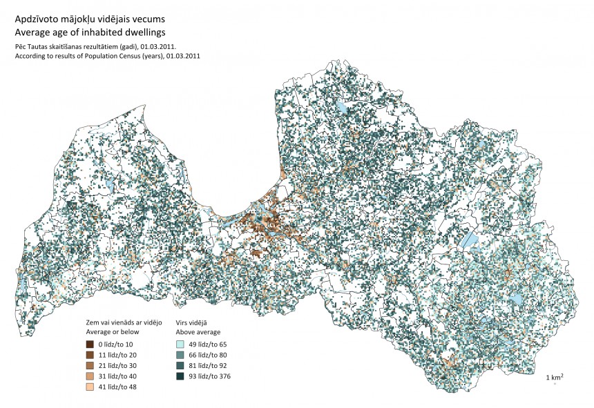 CSP publicējusi režģa kartes, kas attēlo Latvijas apdzīvoto mājokļu vecumu atbilstoši 2011. gada tautas skaitīšanas datiem. Blīvāk apdzīvotās vietās, īpaši Rīgas tuvumā, kur dominē pēdējo 20 gadu laikā celti mājokļi, to vidējais vecums ir mazāks. Savukārt vecāki mājokļi ir laukos ar viensētu apbūvi un atsevišķu pilsētu kā, piemēram, Rīgas vai Liepājas vēsturiskajos centros.