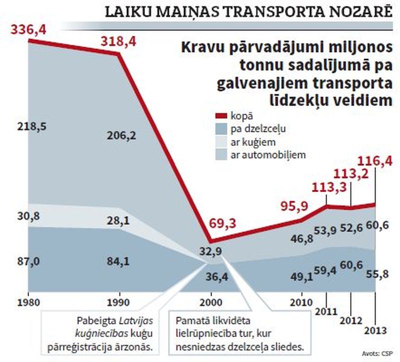 Latvijā pārvadāto kravu kopapjoms joprojām ir reizes trīs mazāks nekā 1990. gadā, ar kuru datēta Latvijas Republikas neatkarības atjaunošana. Statistiķi liecina par 318,4 miljoniem pārvadāto tonnu 1990. gadā un 116,4 miljoniem pārvadāto tonnu 2013. gadā, ar kuru beidzas datu salīdzinājums konkrētajā sadaļā Centrālās statistikas pārvaldes datubāzē. Turpat atrodama arī vēl trakāka liecība, ka 2000. gadā valsts iztikusi, pārvadājot tikai 69,3 miljonus tonnu kravu. Tas nozīmē jūtami mazāku darba apjomu ostās, dzelzceļa un auto pārvadājumos nekā tagad. Tātad nozare nodarbināja mazāk cilvēku, mazāk maksāja valstij nodokļos. Tomēr ne konkrēti tajā gadā, ne vispār gados pirms Latvijas iestāšanās Eiropas Savienībā Latvijā nekas traģisks nenotika. Veselais saprāts un ziņu arhīvi neliecina, ka tajā laikā Latviju būtu piemeklējis bads un citas nelaimes, kas apdraudētu cilvēku un valsts izdzīvošanu. Ļaudīm nekad nepatīk pašreizējais bridis, bet pagātn pagātnē gandrīz vienmēr bijis labāk arī tad, 90. gados visu nozaru rādītāji tiecās uz nulli, ko daudzas nozares sasniedza un kur joprojām ir palikušas.