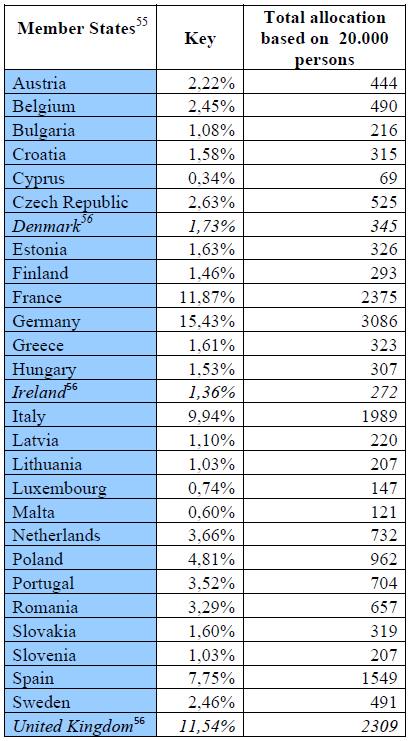 Eiropas Komisija (EK) trešdien ierosinājusi divu gadu laikā uzņemt 20 000 bēgļu un izmitināt tos visās Eiropas Savienības (ES) valstīs, attiecībā uz Lielbritāniju, Īriju un Dāniju nosakot, ka šīs valstis pašas varēs izvēlēties, vai tās kādu bēgli uzņem vai nē.