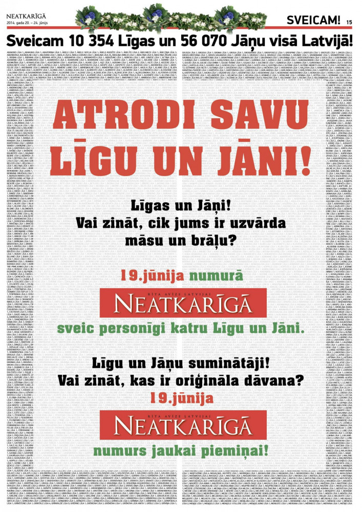 Apsveikums visām Latvijas Līgām un visiem Latvijas Jāņiem vārda dienās – katrs var atrast savu Līgu un Jāni avīzes lappusēs