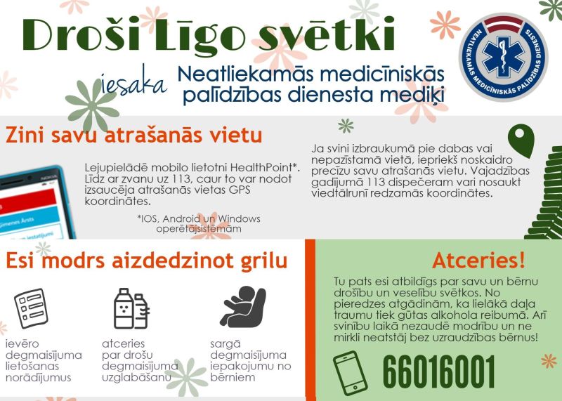 Ņemot vērā iepriekšējo gadu traumu gadījumus, svinot vasaras saulgriežus, Neatliekamās medicīniskās palīdzības (NMP) dienesta mediķi atgādina par piesardzību.