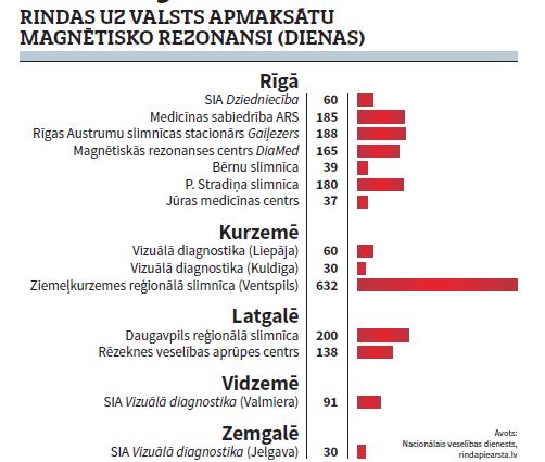 M. Āboliņa norāda, ka reģionos situācija ir labāka, – tur šis pakalpojums šogad vēl ir pieejams, daudzviet iespējams pierakstīties uz septembri, oktobri [rindu garumi uz 1. jūniju aplūkojami tabulā]. Kuldīgā, Liepājā, Jelgavā un Valmierā magnētiskās rezonanses izmeklējums pieejams uz septembri–oktobri, savukārt Latgalē pieraksts ir pilns līdz gada beigām.