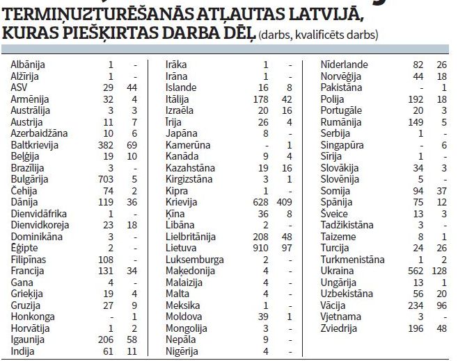 Kopumā darba dēļ izsniegto termiņa uzturēšanās atļauju skaits Latvijā ir lielāks, jo jāņem vērā, ka uz darba attiecību laiku šeit var ierasties arī darbinieka ģimene, tāpēc kopumā uzturēšanās atļaujas izsniegtas 7372 personām, no kurām 1207 ir darbinieku ģimenes locekļi. PMLP dati arī liecina, ka 5163 atļaujas uzturēties Latvijā izsniegtas darba piedāvājuma dēļ, bet 1002 – tieši kvalificēta darba dēļ. Praktiski nav atšķirības starp trešo valstu pilsoņiem un Eiropas Savienības pilsoņiem – abos gadījumos trīs reizes mazāk uzaicināto viesstrādnieku ir kvalificētam darbam. Visvairāk trešo valstu viesstrādnieku ir no Krievijas (616 – no tiem 230 kvalificēta darba veicēji), kam seko Ukraina (533 – no tiem 76 kvalificēta darba veicēji) un Baltkrievija (366 – no tiem 39 kvalificēti darbinieki). Līdz ar viesstrādniekiem Latvijā uzturēšanas atļaujas izsniegtas arī ģimenes locekļiem (tabulā norādīts kopējais izsniegto atļauju skaits gan darbiniekiem, gan viņu ģimenēm). Salīdzinoši augsts viesstrādnieku skaits ir no Filipīnām – 106 strādnieki un divi ģimenes locekļi, kā arī no Indijas – 58 darbinieki (trīs ģimenes locekļi) un desmit kvalificēti darbinieki (viens ģimenes loceklis).