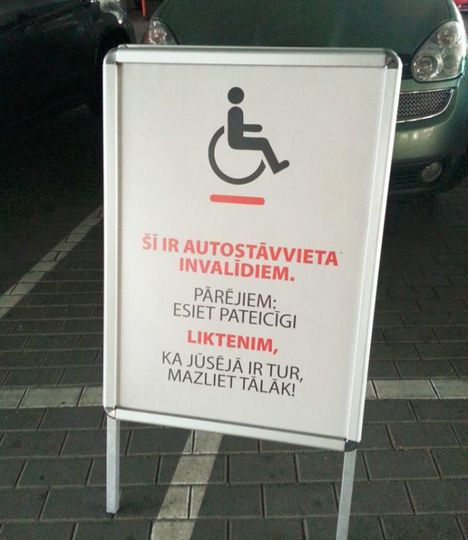 Duntes ielas lielveikala SKY stāvvietā parādījusies zīme, kas domāta visiem tiem blēžiem, kuri ar saviem auto bezkaunīgi aizņem invalīdu stāvvietas.