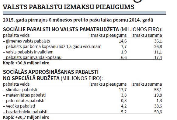 Finanšu ministrija saskaitījusi, ka šā gada pirmajā pusē valsts iztērējusi 4,4 miljardus eiro. 281 miljons kopējiem tēriņiem ir nācis klāt, salīdzinot ar 2014. gada pirmo pusi. Tikai 223 miljoni no izdevumu pieauguma ir segti ar ieņēmumu pieaugumu. Tas apliecina aizvien ātrāku valsts parāda pieaugumu un izraisa bažas, ka atkal var pietrūkt aizdevēju, kas uztic savu naudu izšķērdīgajai Latvijai. Valstij ir kopsummā jāatsauc tie solījumi un saistības pret iedzīvotājiem, kuras tā ielika šā gada budžetā. Finanšu ministrija nepalaida garām iespēju norādīt uz lielākajiem labuma guvējiem no šā gada valsts budžeta izpildes: «Lielākais izdevumu kāpums vērojams sociālajiem pabalstiem un atlīdzībai. Izdevumi sociālajiem pabalstiem šā gada sešos mēnešos pieauga par 95,4 miljoniem eiro jeb 8,1%, kur izdevumi pensijām pieauga par 34,1 miljonu eiro jeb 3,9%, savukārt izdevumi pārējiem sociālajiem pabalstiem – par 61,3 miljoniem eiro jeb 19,5%.» Kuriem tad valsts nodrošinātie ienākumi auguši atbilstoši valsts izdevumu kāpumam par piekto daļu?