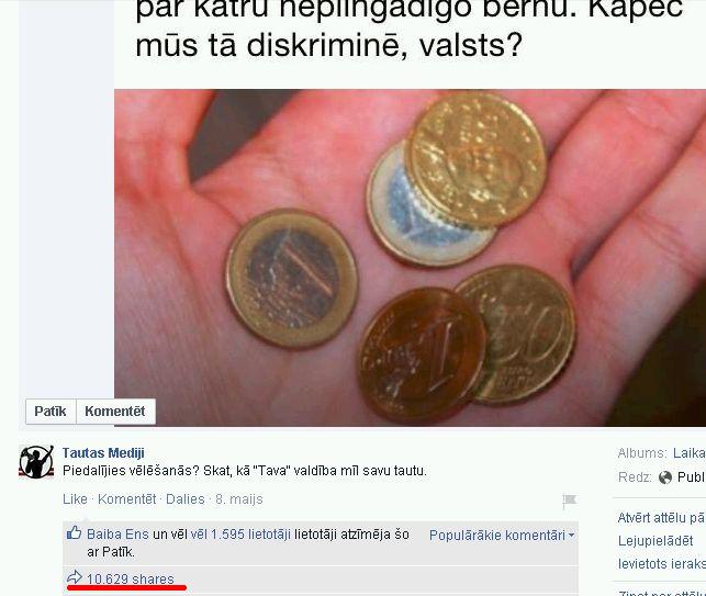 Ievērību izpelnījies kāds 8. maijā publicēts facebook lapas „Tautas Mediji” ieraksts, kurā lasāms: „Vidējā pensija Latvijā ir 248 eiro, bērnu nauda – 11 eiro. Bēgļi Latvijā pirmo gadu saņems 256 eiro mēnesī + 76 eiro par katru nepilngadīgo bērnu. Kāpēc mūs tā diskriminē valsts?”