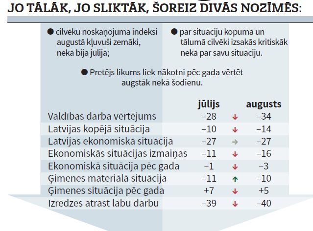 Neapmierinātība ar valdību augustā bija galvenā, kas pasliktināja Latvijas iedzīvotāju kopējo noskaņojumu.