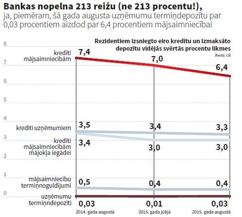 Nullei tuvās, bet oficiāli joprojām virs nulles esošās depozītprocentu likmes dzen stāvus gaisā banku peļņas teorētisko aprēķinu, ja kredītprocentu likmes izdala ar to praktiski neko, ko bankas atdod naudas īpašniekiem depozītprocentos. Ja, piemēram, uzņēmumu termiņnoguldījums par 0,03% gadā šā gada augustā aizdots mājsaimniecībai par 6,4% gadā: 6,4 : 0,03 = 213. Šo attiecību varētu pietuvināt tūkstotim (tūkstoškārtīgai peļņai, nevis 1000% peļņai!), iedomājoties no uzņēmuma paņemtas naudas aizdošanu norēķinu kartes īpašniekam ar likmi ap 23% gadā. Citi salīdzinājumi dod pieticīgākus rezultātus.