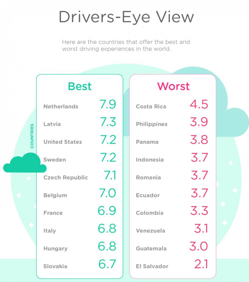 Kā sliktāko pieredzi automašīnas vadīšanās, autovadītāji norādījuši Kostariku, kurai seko Filipīnas, Panama, Indonēzija, Rumānija, Ekadora, Kolumbija, Venecuēla, Gvatemala, Salvadorā. Šajas valstīs autovadītāji sūdzās par sastrēgumiem un slikto ceļu infrastruktūru.