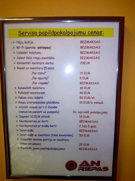 Sociālajos tīklos cilvēki uzjautrinās par kādu riepu servisa cenrādi, kurā iespējams atrast interesantus pakalpojumus un cenas.