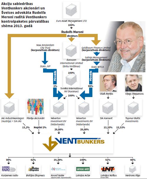 Savukārt 51% LNT akciju tieši pieder akciju sabiedrībai Ventbunkers, kurai Skonto nafta nesen pārdeva vēl 16% LNT akciju. No pēdējā laika notikumu gaitas var prognozēt, ka beigās visa nauda no «lielā» Ventspils naftas darījuma koncentrēsies tieši Ventbunkerā, kur arī beidzot tiks dalīti miljoni starp šajā rakstā pieminētajām personām un citiem Ventbunkers un LNT akcionāriem. Nav šaubu, ka savu daļu par Ventspils stāsta pamešanu saņems arī Meroni.