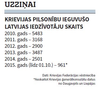 Neatkarīgā vēstīja par juridisko pakalpojumu uzņēmumu, kas reklamē kaimiņvalsts pilsonības iegūšanas iespēju kā izdevīgu veidu agrākai aiziešanai pensijā. Un, iespējams, arī pati pensija būs lielāka, jo, piemēram, tiek ņemti vērā dienesta gadi padomju armijā. Principā likumīgs ceļš, taču no Latvijas valsts interešu viedokļa nav atbalstāms. Izrādās, pēdējos divos gados Latvijas pavalstniecības iemainīšana pret Krieviju kļuvusi mazāk populāra. Pilsonības un migrācijas lietu pārvaldes (PMLP) pieļāvumu, ka tas saistīts ar Ukrainas notikumiem un tiem sekojušo rubļa vērtības kritumu, ko savukārt izraisīja starptautiskās sankcijas, apstiprina Krievijas Federācijas vēstniecības preses dienesta sagatavotā statistika. 2013. gadā Krievijas pilsonību ieguva 3487 Latvijas iedzīvotāji, 2014. gadā jau par tūkstoti mazāk – 2501, bet šogad līdz 1. oktobrim vairs tikai 961. Te gan jāpiebilst, ka pēdējais skaitlis uzrādīts bez Daugavpils un Liepājas ģenerālkonsulātu datiem, tikai Krievijas vēstniecības Konsulārās nodaļas informācija.