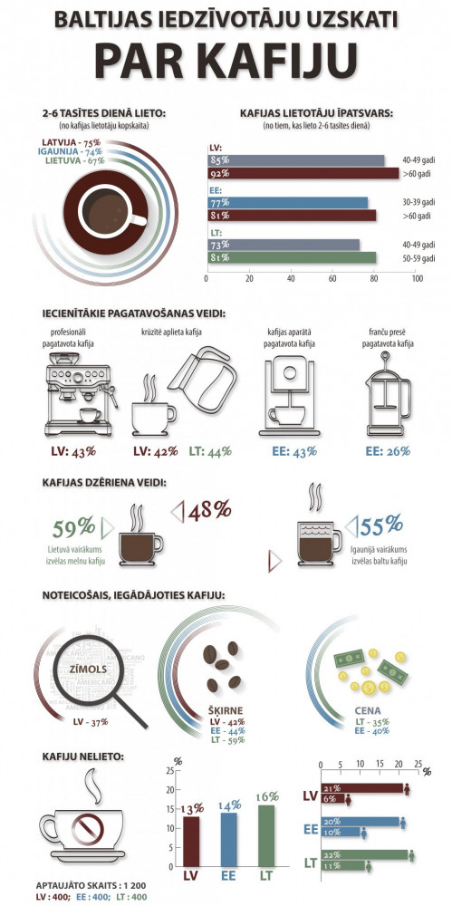 Šī gada oktobrī veiktā aptauja rāda, ka Latvija ir lielākā kafijas patērētāja Baltijā – 75% aptaujāto kafijas lietotāju Latvijā dienā izdzer vismaz divas tasītes kafijas, visbiežāk izvēloties krūzītē aplietu kafiju vai profesionāli pagatavotu kafiju, piemēram, kafejnīcās . Līdzīgi ir arī Lietuvā – vismaz divas tasītes dienā izdzer gandrīz 3/4 aptaujāto kafijas mīļotāju, taču lielāku priekšroku dodot krūzītē aplietai kafijai. Mazāk kafiju dzer Igaunijā – tur attiecīgo daudzumu dienā patērē vien 2/3 aptaujāto, taču Igaunijā ir lielāks skaits tādu, kuri ikdienā izdzer pat 4-6 kafijas tasītes. To, ka kafiju nedzer, biežāk norāda vīrieši (21%), kā arī gados jaunākie iedzīvotāji (18-29).