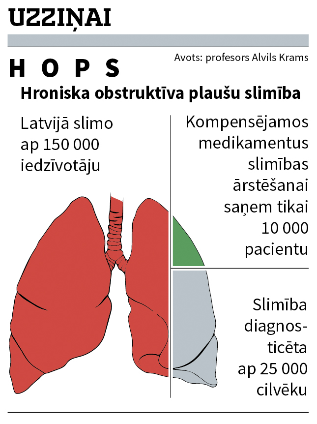 Mēs varam tikai minēt, cik Latvijā ir hroniskas obstruktīvas plaušu slimības (HOPS) pacientu, jo lielākajai daļai diemžēl šī slimība nav diagnosticēta. Tāpēc cilvēki pāragri aiziet bojā, nosmokot, jo nesaņem adekvātu ārstēšanu. Smacējošais bronhīts – tā šo saslimšanu dēvē ārsti.