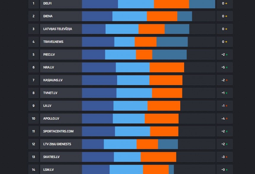 Portālam nra.lv ir izdevies apsteigt tādus "smagsvarus" kā tvnet.lv, LTV Ziņu dienests, apolllo.lv un lsm.lv. Mēs esam spējuši pakāpties no 8. un 11. pozīcijas attiecīgi augustā un septembrī, līdz 6. vietai oktobrī. Paldies par jūsu atzinību un uzticēšanos!