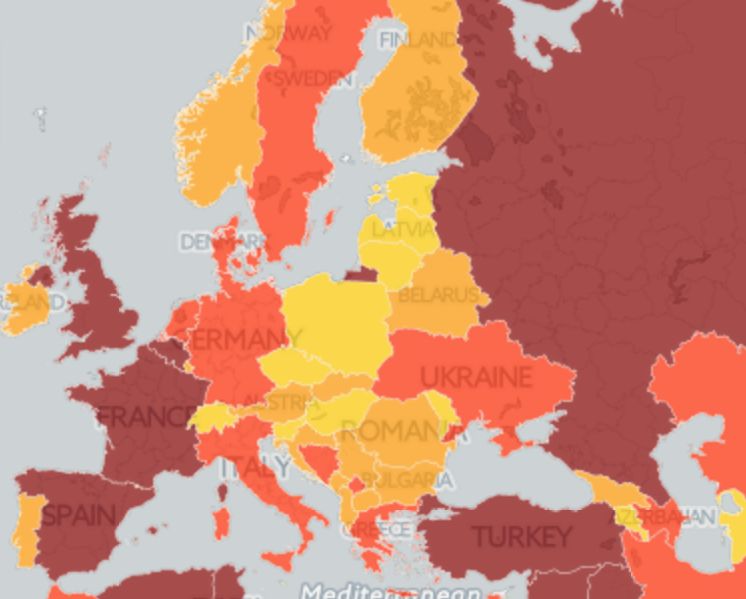 No Eiropas valstīm Latvija, Lietuva, Igaunija, Čehija un Polija atzīmētas ar gaiši dzeltenu un tiek raksturotas kā vienas no drošākajām valstīm pasaulē.