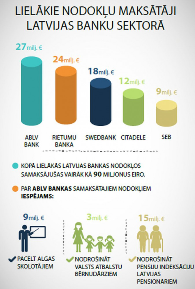 Piecas lielākās Latvijas komercbankas nodokļos 2014. gadā samaksājušas vairāk nekā 90 miljonus eiro. Līderis nodokļu maksājumos ar 27 miljoniem eiro ir ABLV Bank, savukārt Rietumu banka samaksājusi 24 miljonus eiro, Swedbank – 18 miljonus, banka Citadele - 12 miljonus, bet SEB Banka – 9 miljonus eiro.