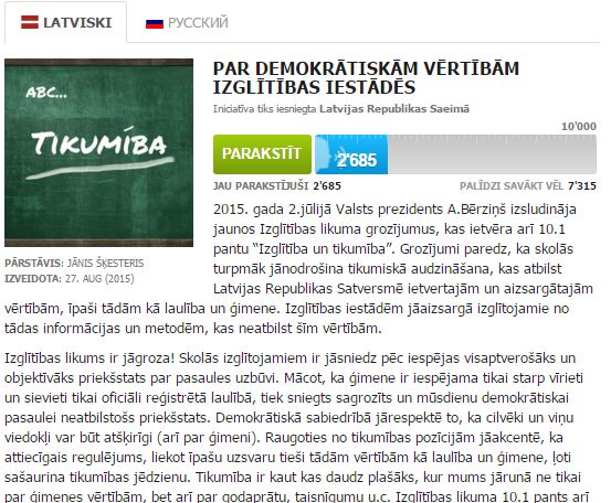 Kā ziņots, 2015. gada 2.jūlijā Valsts prezidents A.Bērziņš izsludināja jaunos Izglītības likuma grozījumus, kas ietvēra arī 10.1 pantu “Izglītība un tikumība”. Grozījumi paredz, ka skolās turpmāk jānodrošina tikumiskā audzināšana, kas atbilst Latvijas Republikas Satversmē ietvertajām un aizsargātajām vērtībām, īpaši tādām kā laulība un ģimene. Izglītības iestādēm jāaizsargā izglītojamie no tādas informācijas un metodēm, kas neatbilst šīm vērtībām.