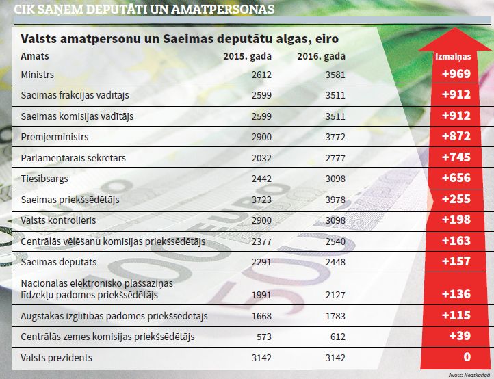 Lēmums par Ministru prezidenta, ministru, parlamentāro sekretāru, Saeimas frakciju un komisiju vadītāju algu palielināšanu par 600–700 eiro mēnesī bija kā pliķis sejā izglītības un zinātnes nozares darbiniekiem un daļai sabiedrības. Taču īstenībā patiesais atalgojuma palielinājums ir daudz lielāks. Ministru prezidents ar šo gadu par darbu mēnesī uz papīra saņems 3772 eiro, kas ir par 872 eiro vairāk nekā pērn, ministriem pamatalga pieaugs par 969 eiro mēnesī, savukārt Saeimas frakciju un komisiju vadītājiem – par 912 eiro mēnesī.