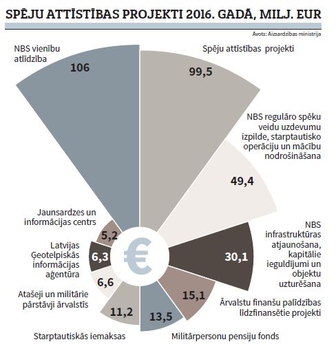 Valsts budžeta statistikas grafiskajā pankūkā no katra nodokļos saņemtā eiro uz Aizsardzības ministriju šogad attiecas 4 centus liels sektors. Nozarei tā ir milzīga darba uzvara, jo aizsardzībai atvēlētie 368 miljoni eiro beidzot sasniedz pirmskrīzes līmeni.
